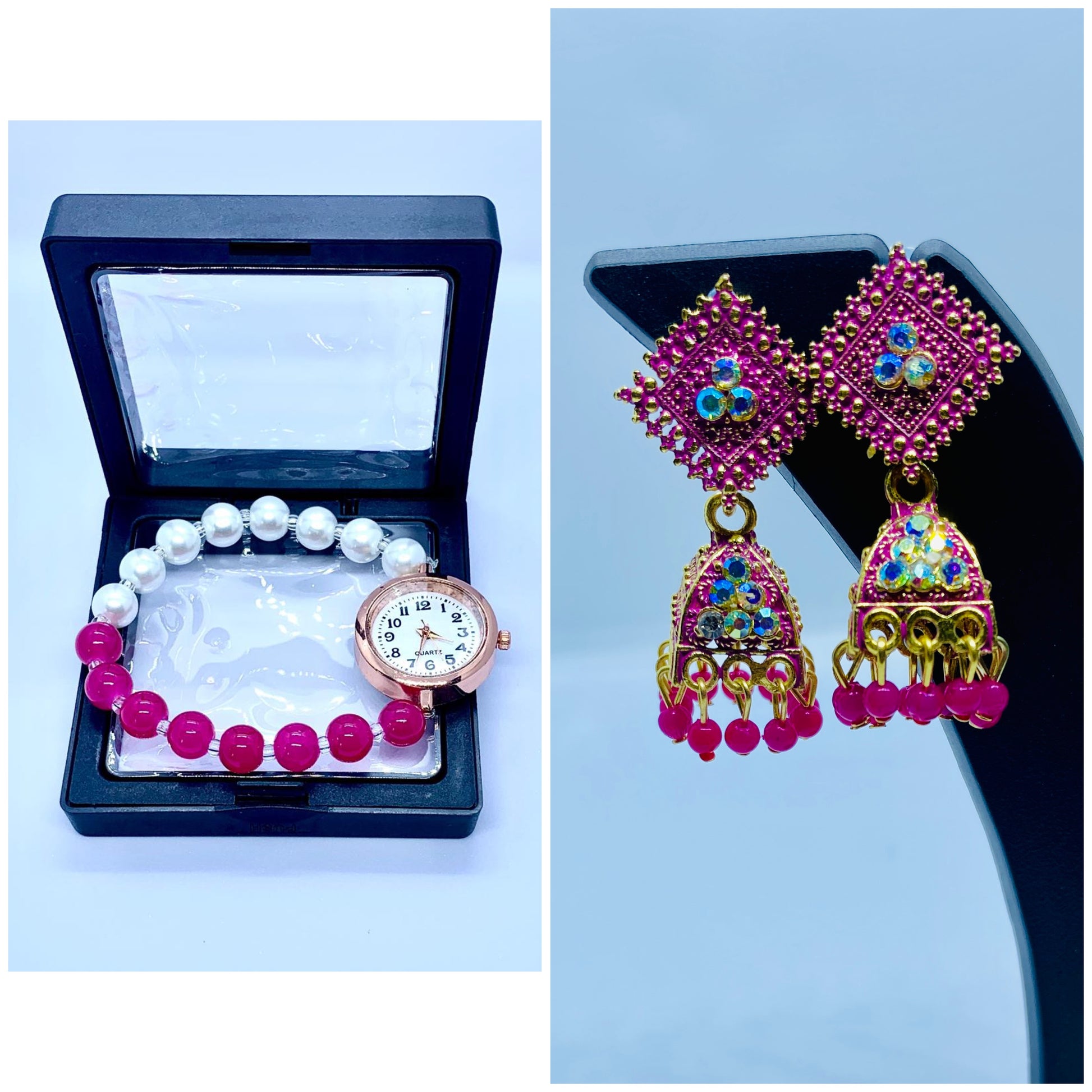 “Pink Beaded Bracelet with Watch & Intricate Ethnic Earrings Set”